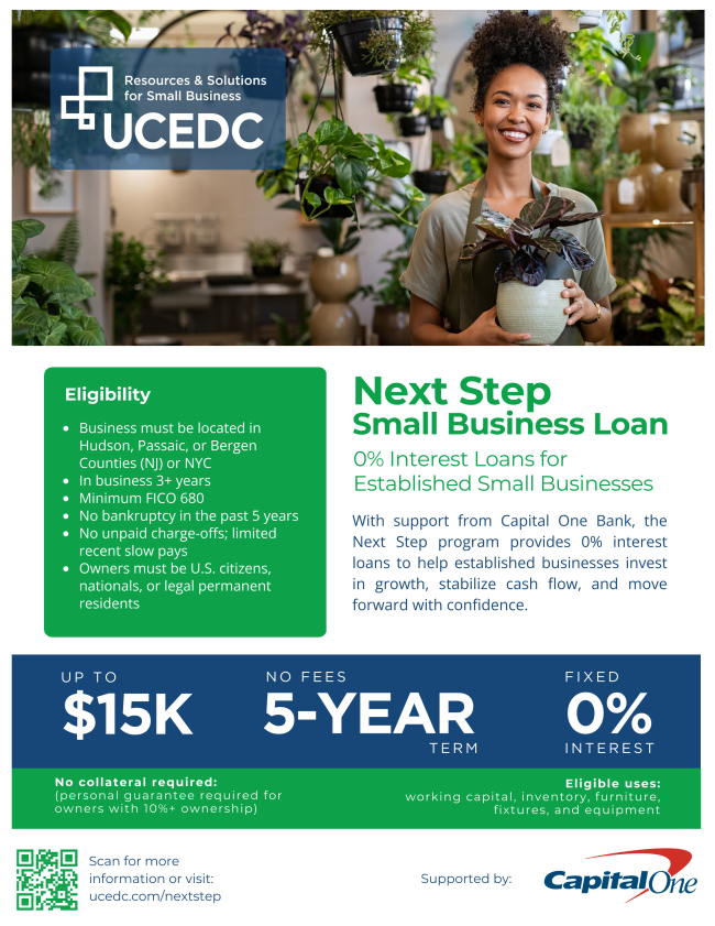 0% Interest Small Business Loans The UCEDC Next Step Small Business Loan Program offers qualifying small businesses access to 0% interest financing to support growth, working capital, equipment, and inventory